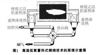 通過蓄熱式燃燒原理可知.常溫空氣是用高壓風機由四通換向閥切換進入預熱器后在短時間內被加熱到700℃左右,熱空氣進入爐膛后,抽吸周圍低氧爐氣,從而形成含氧量低于21%(一般在15%)的低氧高溫空氣。然后再與空氣噴嘴附近噴入的燃料混合燃燒。