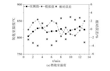 在連續(xù)監(jiān)測穩(wěn)定運行階段多個切換周期后,將燃燒室三個熱電偶及變送器監(jiān)測的爐膛溫度值計算得到平均值,同時將每個蓄熱室中的出口位置熱電偶的溫度值進行記錄,圖2為同一測點的工程實際數據與數值模擬值的對比。通過對比,得到溫度模擬數據與實際監(jiān)測值的相對誤差均在4%以內,這也可能是RTO裝置的切換閥因閥板和閥座密封性很難保證、氧化爐爐膛上部的防爆裝置存在泄漏,以及溫度監(jiān)測設備的精確度不夠等問題造成的。因此,燃燒室和蓄熱室溫度測點監(jiān)測值的平均值和模擬值相對誤差滿足數值模型準確性的要求,所以此數值模型可以較好的反應RTO裝置在正常運行階段的溫度變化情況。